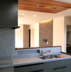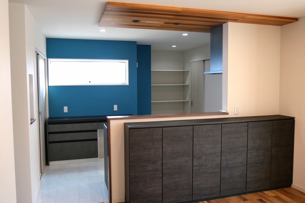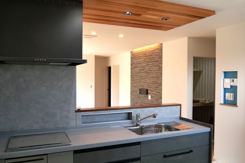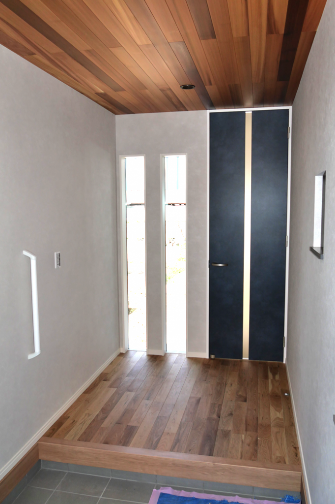 玄関の天井とキッチンの天井はレッドシダー(無垢)で仕上げました